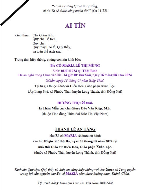 Bà cố Maria Lê Thị Mừng - Sinh năm: 1934 tại Hà Nam Đã an nghỉ trong Chúa vào lúc 14 giờ 10’ thứ Sáu, ngày 16 tháng 08 năm 2024.