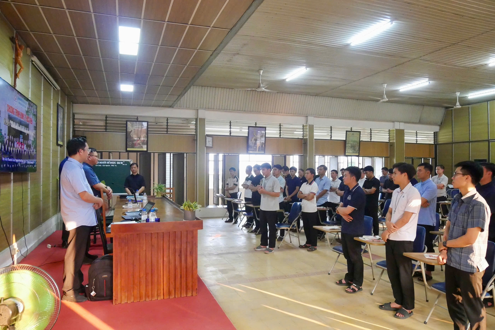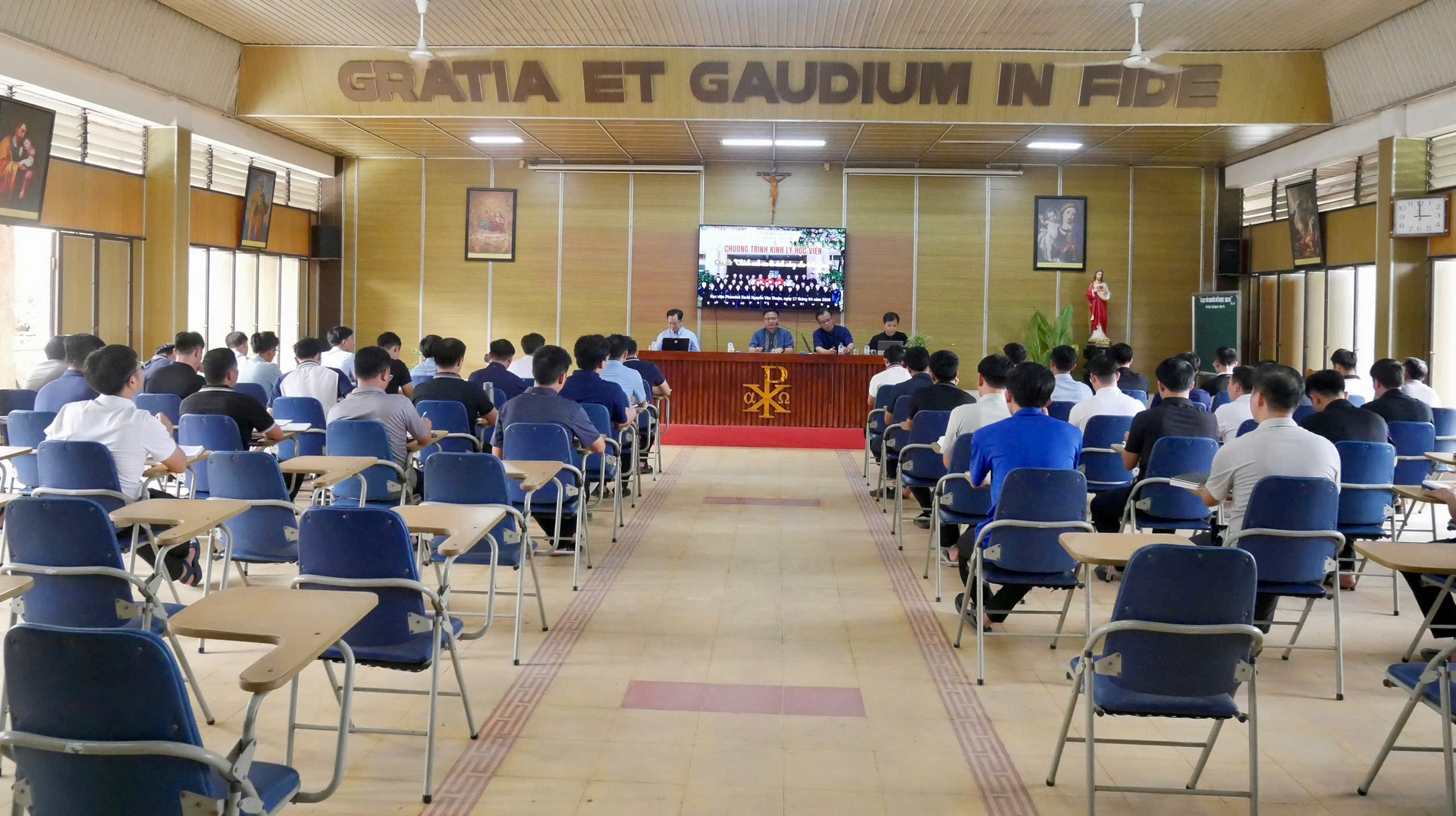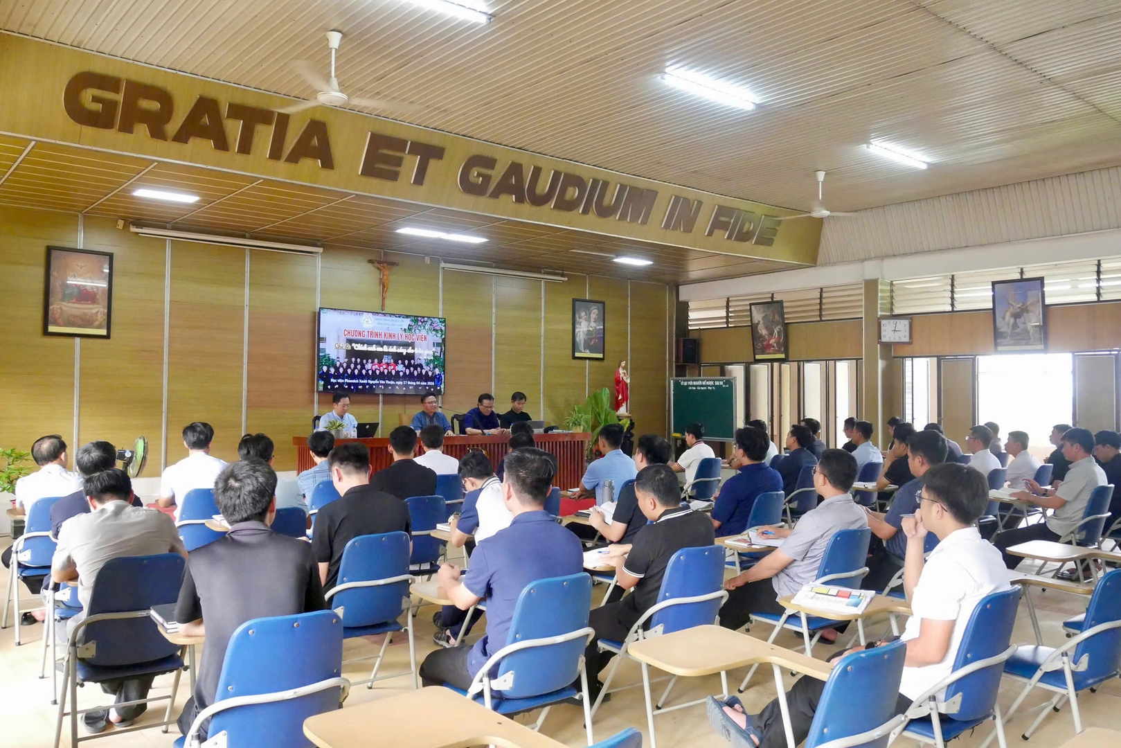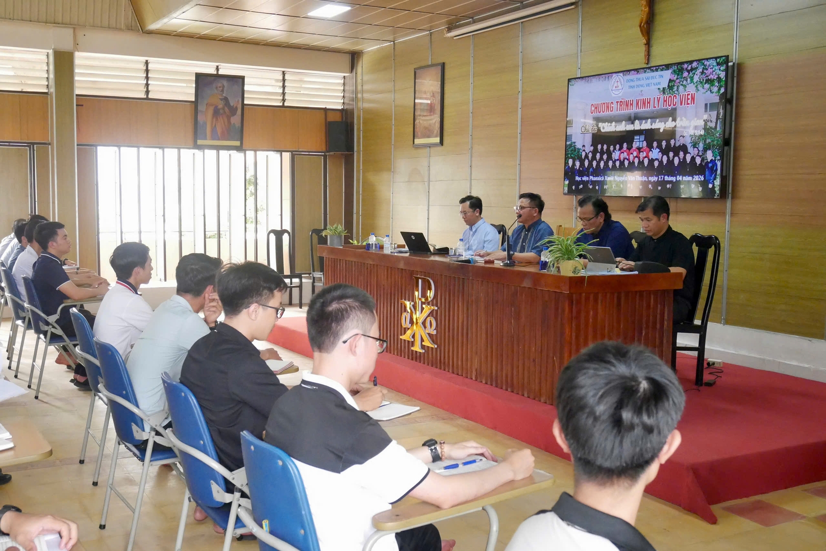 Tiếp đó, vào lúc 15g00 ngày 17/4/2026, cha Giám tỉnh cùng Ban Cố vấn đã gặp gỡ 48 quý thầy đang hiện diện tại Học viện. Trong bầu khí cởi mở, chân thành và xây dựng, quý cha khích lệ quý thầy mạnh dạn chia sẻ với tinh thần tự do và trách nhiệm. Đồng thời, quý cha cũng đưa ra những định hướng cụ thể cho sứ vụ hiện tại và tương lai của anh em Thừa Sai Đức Tin. Quý cha đặc biệt nhấn mạnh việc mỗi người cần có kế hoạch rõ ràng trong đời sống hằng ngày và không ngừng trưởng thành trong đời sống thánh hiến.
