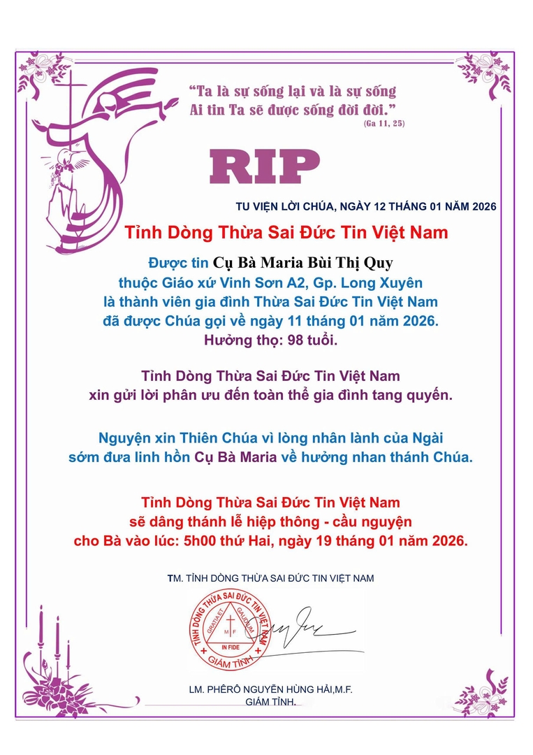 TM. TỈNH DÒNG THỪA SAI ĐỨC TIN VIỆT NAM