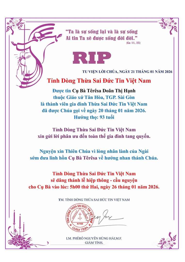 đã được Chúa gọi về ngày 20 tháng 01 năm 2026.