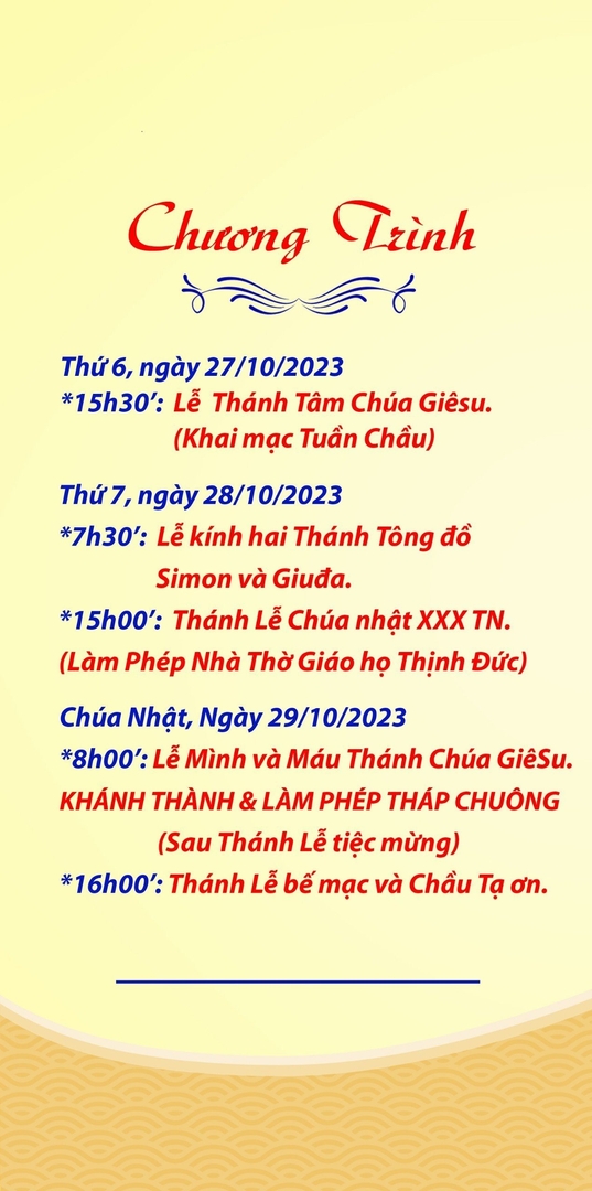 Từ Thứ Hai, ngày 23/10 – Chúa Nhật, ngày 29/10/2023, Gx. Trung Hòa, Giáo hạt Bột Đà, Gp. Vinh, sẽ diễn ra tuần Chầu Đền Tạ Chúa Giêsu Thánh Thể và cao điểm là Thánh lễ Khánh Thành và Làm Phép Tháp Chuông Nhà Thờ Gx. Trung Hòa vào lúc 8:00 Chúa Nhật, ngày 29/10/2023.