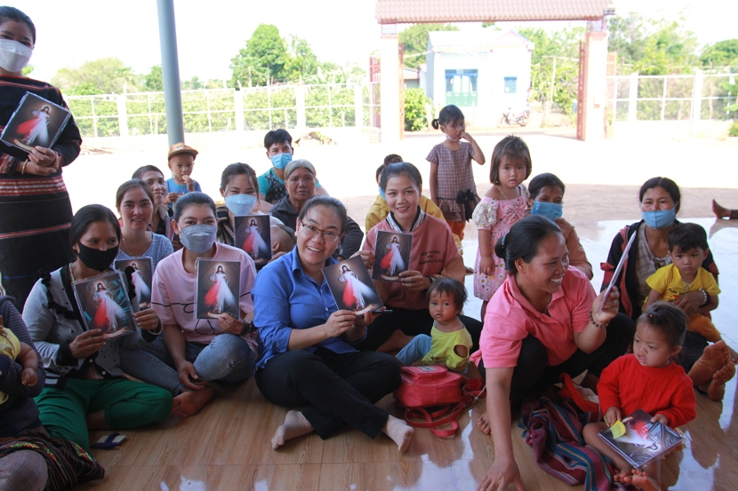 Hôm sau, ngày 23-04-2022, gửi những mệt mỏi hôm qua cho Chúa, đoàn đã khởi hành rất sớm đến một nhà thờ họ gần cộng đoàn để thăm hỏi và chia sẻ 150 phần quà cho bà con sắc tộc nơi đây. Tiếp đó, đoàn cùng nhau ăn sáng và tiếp tục chuyến hành hương về với Trung tâm hành hương Đức Mẹ Măng Đen – Đức Mẹ của người đau khổ và bệnh tật.