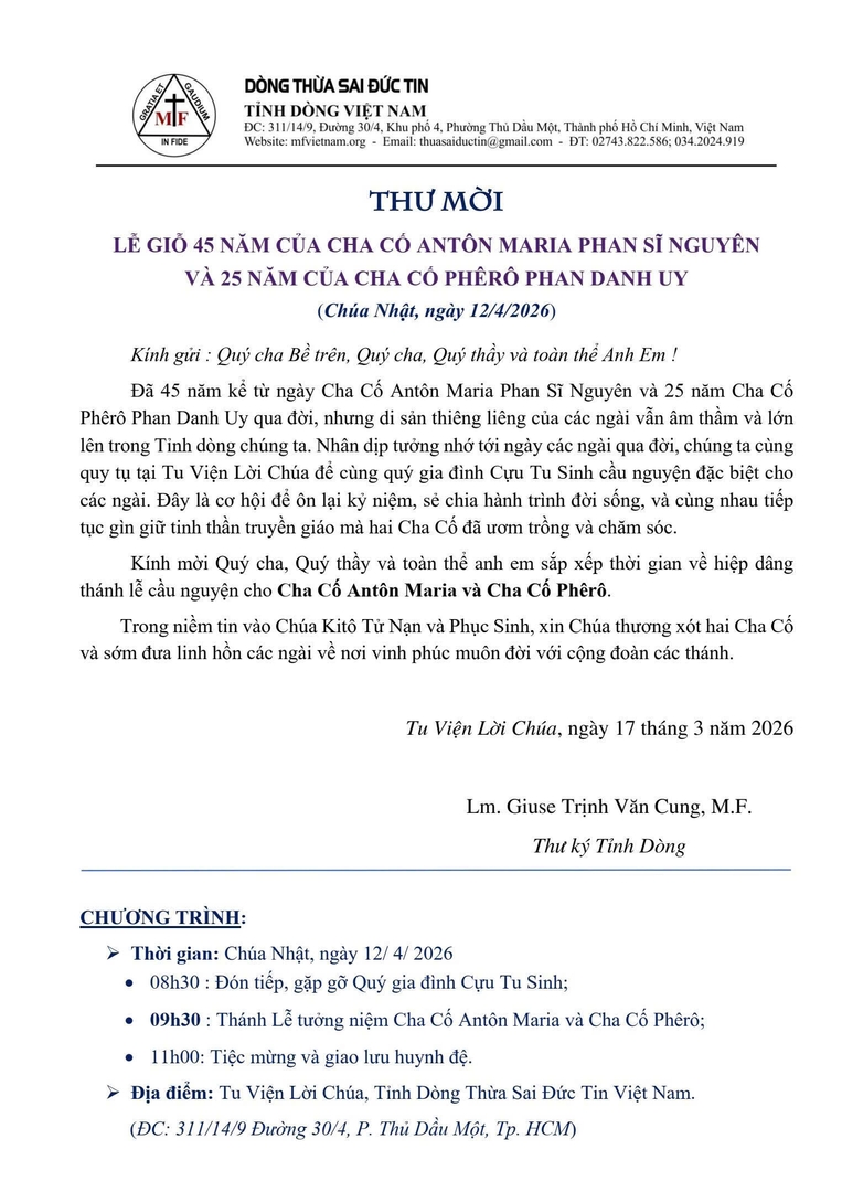 Thư Mời: Lễ Giỗ 45 Năm Của Cha Cố Antôn Maria Phan Sỹ Nguyên